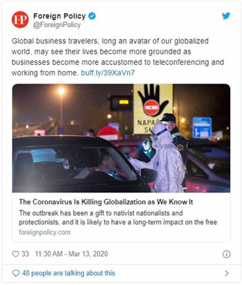 Philippe Legrain, fondateur du Open Political Economy Network (OPEN), déclare que la propagation du COVID-19 « est un cadeau offert aux nationalistes nativistes et aux protectionnistes ».