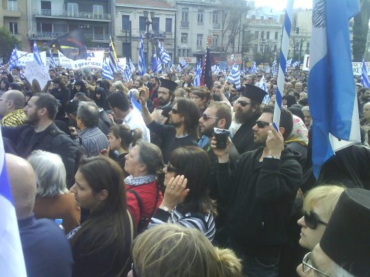Apoi manifestanţii au pornit în mars paşnic către Parlamentul Grecilor strigând lozinci precum „NU cardului cetăţeanului!”, „Grecia creştinilor Ortodocşi”, „Grecia înseamna Ortodoxie!”, „Afară masonii din Parlament!” şi cântând imnul naţional şi „Apărătoare Doamnă”. Puternică a fost prezenţa tinerilor care cu vocile lor viguroase au dat un ton diferit marşului. Trebuie să îi felicităm pe aceşti tineri, pentru că multi dintre ei s-au implicat în organizarea şi desfăşurarea evenimentului prin distribuirea de pliante şi postarea de panouri etc.