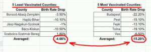 De exemplu, Igor Chudov a arătat că, în Ungaria, primele 5 districte cel mai puțin vaccinate au înregistrat o scădere medie a natalității cu doar 4,66%, în timp ce primele 5 județe cu cele mai mari rate de vaccinare au înregistrat o scădere a natalității cu 15,20% (mai jos, captură foto cu un tabel cu datele).