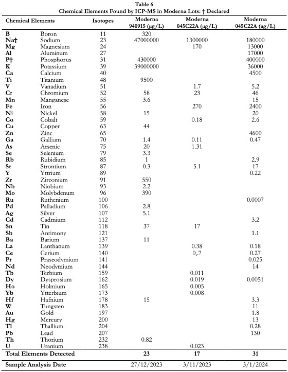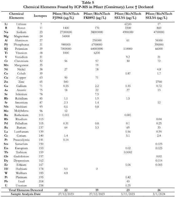 „Analiza noastră rezumată în Tabelele 9 și 10 arată prezența a 55 de elemente chimice nedeclarate în cele 17 probe analizate de la cele 6 mărci de vaccinuri anti-covid-19. Printre elementele nedeclarate s-au descoperit cele din toate grupele din Tabelul Periodic, cu excepția gazelor nobile”, se arată în studiu în secțiunea „Discuții”.
