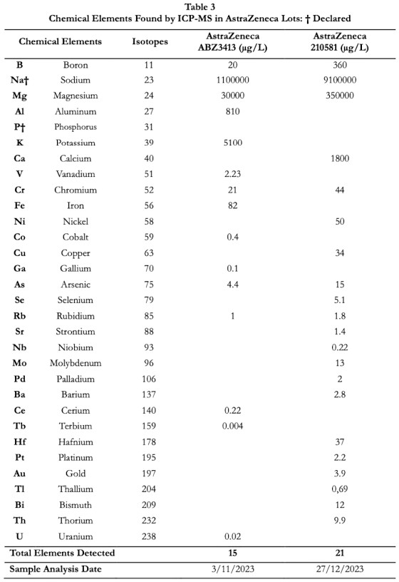 „Analiza noastră rezumată în Tabelele 9 și 10 arată prezența a 55 de elemente chimice nedeclarate în cele 17 probe analizate de la cele 6 mărci de vaccinuri anti-covid-19. Printre elementele nedeclarate s-au descoperit cele din toate grupele din Tabelul Periodic, cu excepția gazelor nobile”, se arată în studiu în secțiunea „Discuții”.
