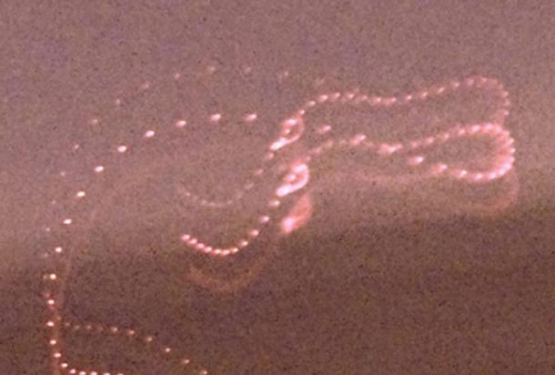 Fotografie a unei ETI-2 arătând mișcarea acesteia. Entitatea constă în lumină de diferite culori care pulsează și se deplasează sincronizat în conformitate cu o traiectorie complexă pe durata expunerii de 15 secunde, incluzând un punct în care mișcarea s-a oprit pentru câteva secunde, pentru a fi reluată ulterior