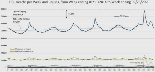 Essentiellement, il y a un nombre approximatif de décès chaque année dus à diverses causes qui, pour la plupart, sont restées constantes au fil des ans. Cela inclut des comorbidités telles que les maladies cardiovasculaires, qui ont longtemps été la principale cause de décès, et le cancer, qui a longtemps été un fléau pour notre existence. Pour que le Covid-19 soit une cause d’inquiétude sérieuse, il faudrait que le nombre de décès moyens augmente de manière significative.