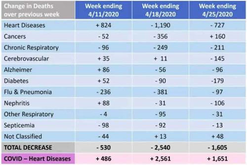 « Les CDC a classé tous les décès liés à COVID-19 simplement comme des décès COVID-19. Même les patients qui meurent d’autres maladies sous-jacentes mais qui sont infectés par COVID-19 comptent comme des décès COVID-19. C’est probablement la principale explication de l’augmentation drastique des décès liés au COVID-19 alors que les décès par toutes les autres maladies ont connu une baisse significative… »