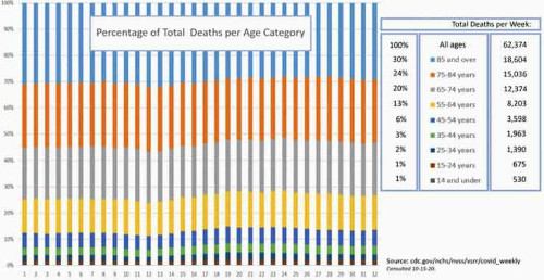 En outre, les recherches de Briand indiquent que le pourcentage de décès est resté relativement constant dans toutes les tranches d’âge. Les statistiques sur les décès dus au covid semblent refléter la répartition normale des décès entre les groupes d’âge, ce qui donne encore plus de crédit à l’argument selon lequel de nombreux décès dus au covid sont des décès recatégorisés.