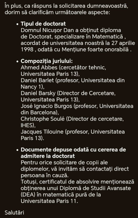 Universitatea Paris Nord (Paris 13) a confirmat că Nicușor Dan s-a înscris la doctorat fără diplomă de licență, conform profesorului și jurnalistului Horea Bădău. Toate indiciile arată că Nicușor Dan a ajuns în Franța fără o astfel de diplomă.