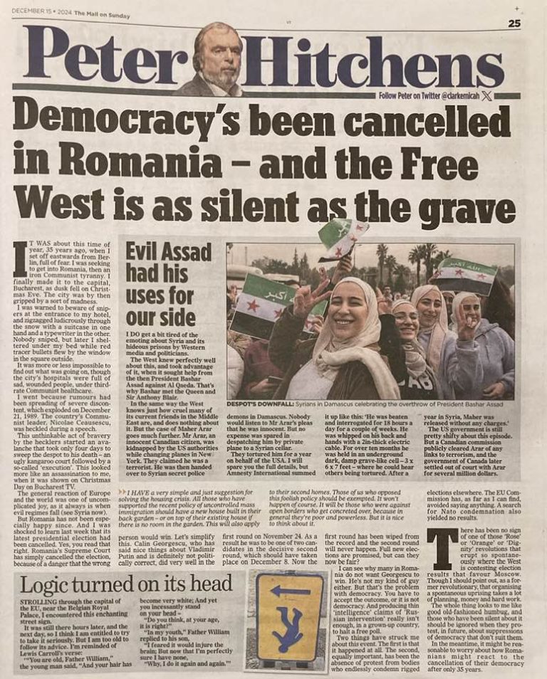 Unul dintre cei mai respectați jurnaliști britanici în viață, venerabilul Peter Hitchens, a scris că decizia de anulare a alegerilor din România este o „farsă”.