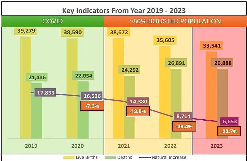 Numărul total cumulat de decese covid în Singapore este de 2.024, dar creșterea naturală a populației (nașteri vii minus decese) este în scădere și continuă să scadă cu mai multe ordine de mărime decât numărul total de decese legate de covid de până acum.