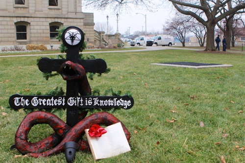 En 2014, le temple satanique a installé un présentoir « vacances » devant le Michigan Capitol. Le serpent et la croix forment le symbole de la croix satanique, basée sur le symbole alchimique du soufre. Pourquoi soufre ? Parce que la Bible dit que l’enfer sent le soufre.