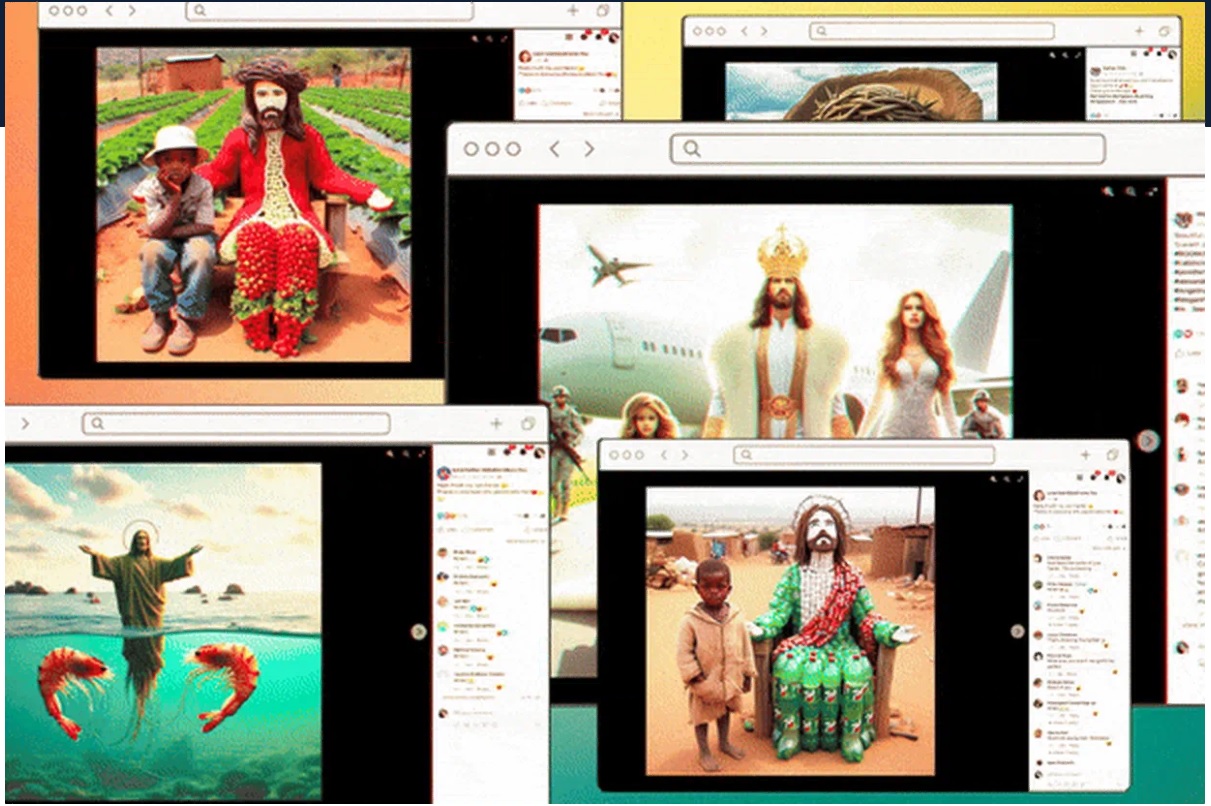 Majoritatea imaginilor provin de la zeci de pagini de Facebook care postează aproape la fiecare oră din zi, multe dintre ele centrate în mod inexplicabil pe teme care îl implică pe Iisus și însoțitoarele de bord. Unele dintre aceste pagini și-au creat un număr considerabil de adepți în ultimele luni, iar postările au adunat deseori comentarii care variază de la laude de tip chat-bot la comentarii răutăcioase la adresa utilizatorilor care par să creadă că imaginile sunt reale.