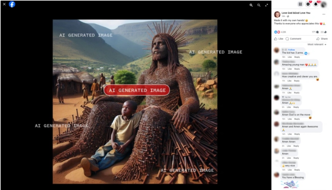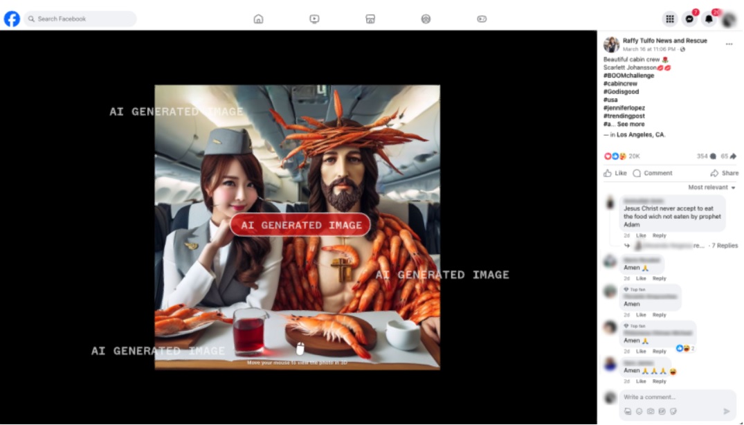 Multe dintre imaginile generate de inteligența artificială atrag fluxuri de utilizatori care comentează „Amin” la imagini bizare cu Iisus, laudă munca impresionantă a unor artiști inexistenți sau urează la mulți ani unor copii falși care stau jalnic în noroi. 404 Media, un startup de știri axat pe tehnologie, a fost primul care a raportat despre imaginile AI care au inundat Facebook.