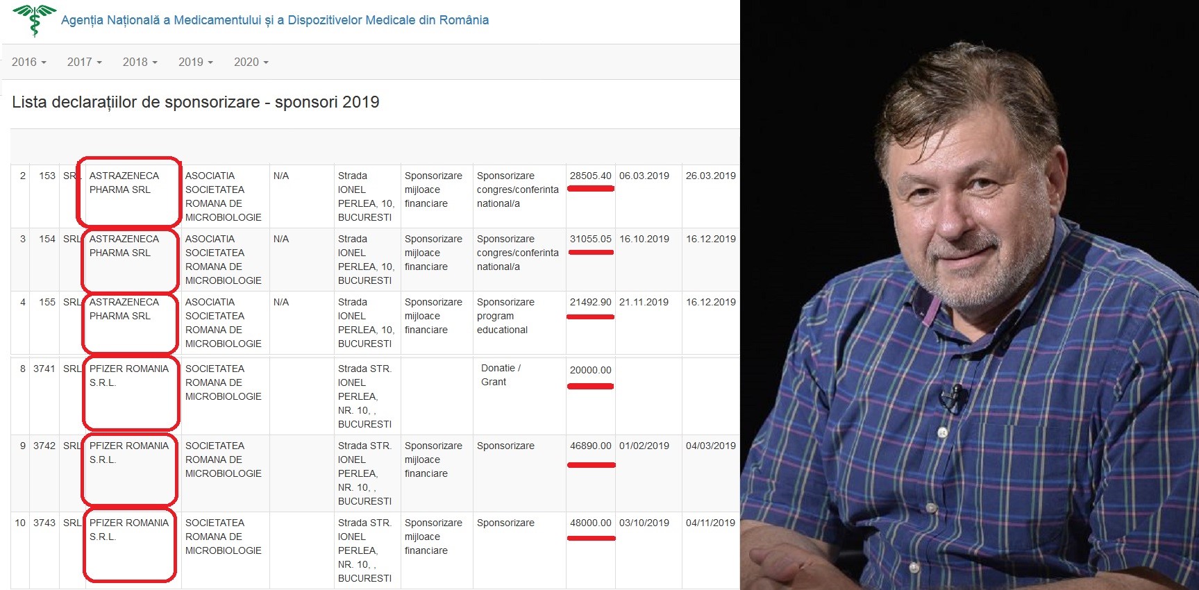 În 2019, ONG-ul lui Rafila are 13 sponsorizări de la BigPharma, dintre care 3 de la AstraZeneca și 3 de la Pfizer. AstraZeneca a cotizat cu 28.505, 31.055 și 21,492 LEI, iar Pfizer cu 20.000, 46.890 și 48.000 LEI (captură foto mai sus).