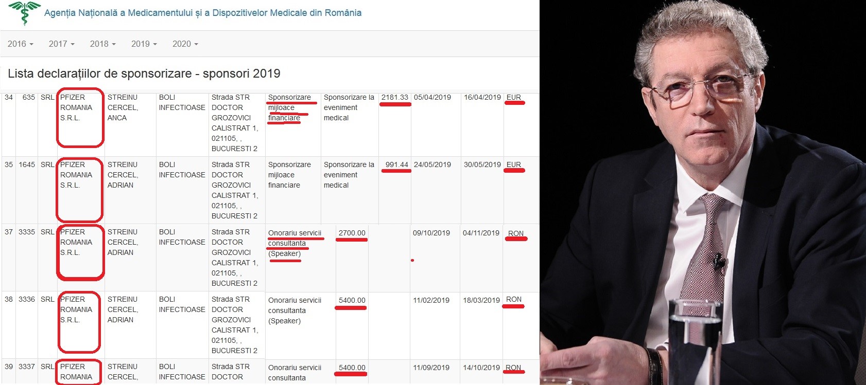 Deocamdată, ne mulțumim cu ce avem. Ca atare, conform sursei numite, descoperim că ONG-ul lui Rafila a primit în 2014 de la Pfizer un grant de 44.847 lei și două sponsorizări de 22.137 lei, respectiv 31.293 lei, iar Adrian Streinu-Cercel a încasat de la Pfizer pentru „Activitate de conferențiere / Consultanță” sumele de 2.200, 2.225, 2.250, 2.250, 2.250 (de trei ori la fel) și 4.400 (aici a vorbit mai mult, se pare).