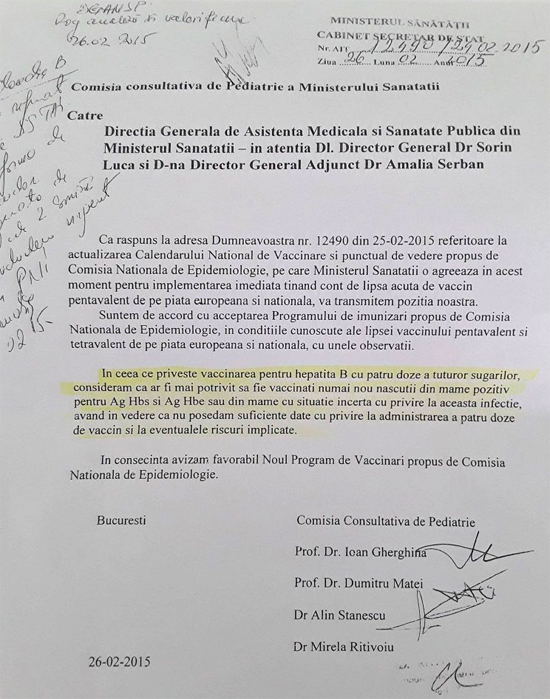 Revenind: Comisia consultativă de Pediatrie a Ministerului Sănătății recomanda în februarie 2015 doar vaccinarea nou născuților „din mame pozitiv pentru Ag Hbs și Ag Hbe sau din mame cu situație incertă cu privire la această infecție, având în vedere că nu posedăm suficiente date cu privire la administrarea a patru doze de vaccin și la eventualele riscuri implicate.”