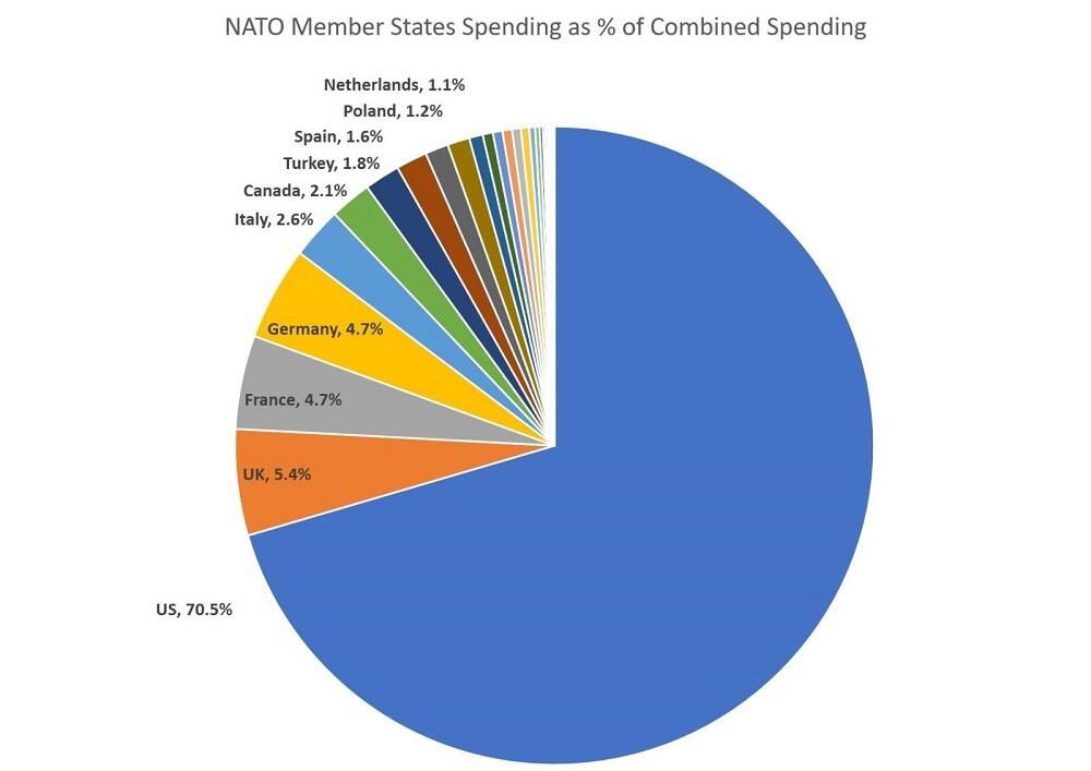 De exemplu, SUA reprezintă aproximativ 70% din totalul cheltuielilor anuale combinate pentru apărare ale țărilor NATO. Nicio altă națiune nu se apropie.