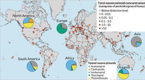 Pesticidele neonicotinoide au fost găsite în miere, pe fiecare continent. Un studiu desfășurat la nivel global, care a testat concentraţia de chimicale din miere, a scos la iveală amploarea expunerii albinelor la pesticide.