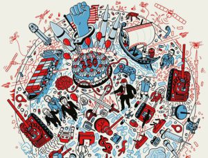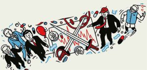 Linia roșie a graficului arată ceva care atinge un minim istoric. Reprezintă valoarea dolarului american (în jurul graficului sunt afișate monede de un cent), piața bursieră sau economia în general? Cele două săbii aflate peste grafic sugerează că cifrele în scădere pot fi cauzate de războaiele comerciale. De o parte și de alta a graficului se află șefi de stat precum Xi Jinping și Trump, care par să se afle pe un teren instabil și luptă să rămână în picioare.