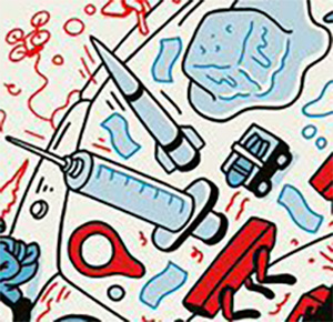 Pe copertă sunt două seringi gigantice. În ambele cazuri, ele se află chiar lângă rachete, indicând faptul că pot fi folosite ca arme. În aceeași ordine de idei, întreaga copertă este plină cu un număr enorm de pastile de toate felurile, sugerând faptul că populația generală asistă la acest haos dintr-o ceață provocată de medicamente. Aceste imagini combinate reprezintă puterea tot mai mare a corporațiilor farmaceutice în societate.