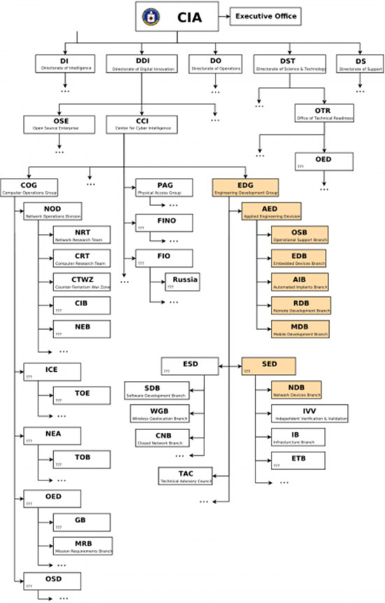 „CIA malware” și celelalte instrumentele de hacking sunt construite de Grupul de Dezvoltare Inginerească – EDG (Engineering Development Group), un grup de dezvoltare de software din cadrul CCI (Centrul pentru Inteligenţă Cibernetică – Center for Cyber Intelligence), un departament aparținând DDI CIA (Direcția pentru Inovare Digitală). DDI este una dintre cele cinci direcții majore ale CIA (a se vedea organigrama CIA pentru mai multe detalii).
