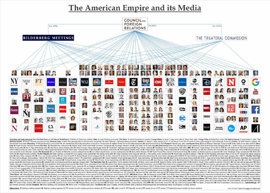 Les meilleurs journalistes et cadres de toutes les grandes entreprises médiatiques sont intégrés dans le CFR. Comme l’illustre le graphique ci-dessous, le CFR a encore plus de contrôle dans les médias grand public que le méchant Groupe Bilderberg et la Commission trilatérale.