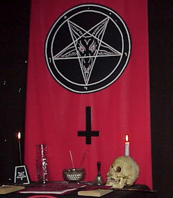 Un altar dintr-o biserică satanistă prezentând o cruce răsturnată.