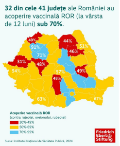 Acoperirea vaccinală pentru ROR este sub 70% în 32 din cele 41 de județe ale României, în unele județe fiind sub 50% sau chiar sub 40%, relatează Ediție de Vrancea.